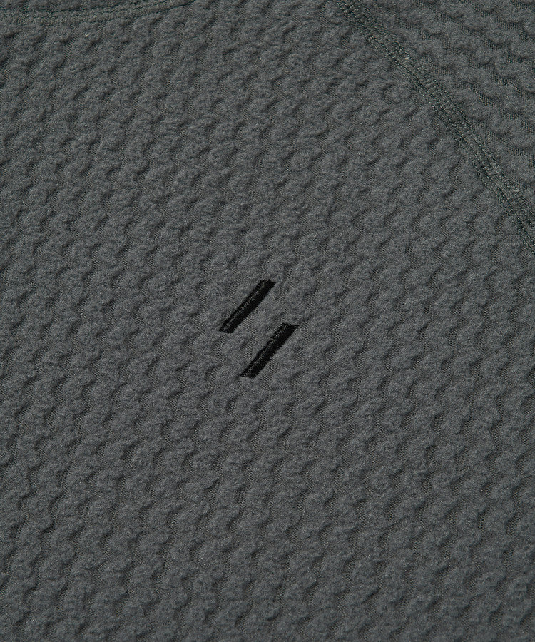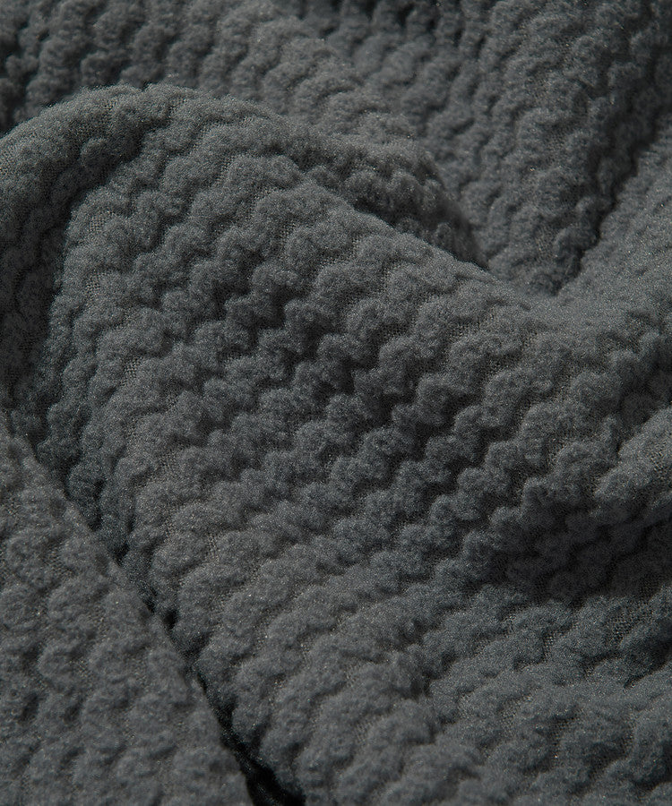 Made with FLYING TEX® Wave Fleece in a unique 3D jacquard knit, this pullover creates air pockets that enhance insulation while keeping the fabric light and breathable. Brushed on both sides for softness, it offers a plush, cozy feel with a weight of around 250gsm, striking a balance between warmth and wearability across seasons. The hood extends high to provide extra coverage, while features like thumbhole cuffs, gusset details, and reflective zipper pullers add functionality. A logo elastic band and subtle embroidery provide brand identity and style.